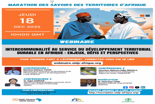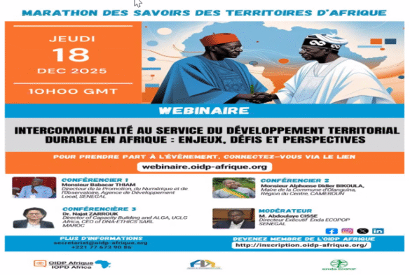 Dakar, le 18 décembre 2025 – Alors que les villes africaines grandissent à un rythme sans précédent et que les inégalités entre territoires se creusent, la question de la gouvernance locale devient plus pressante que jamais. C’est dans ce contexte que l’Observatoire International de la Démocratie Participative en Afrique (OIDPA) et l’organisation Enda ECOPOP organisent, le 18 décembre prochain, un webinaire de haut niveau sur le thème : « Intercommunalité au service du développement territorial durable en Afrique : enjeux, défis et perspectives ».